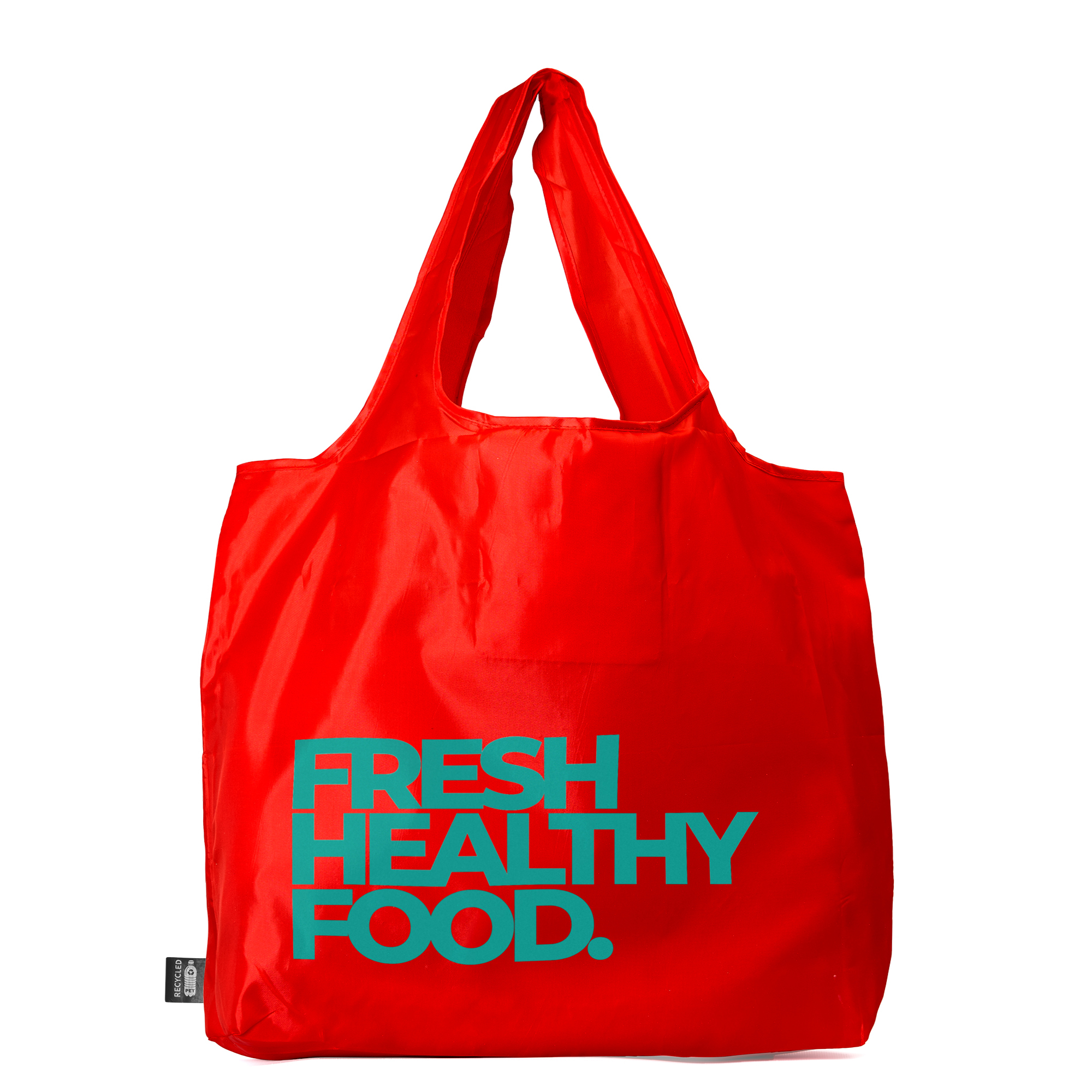 Bolsa de la compra plegable realizada en suave poliéster reciclado RPET. Incluye práctico bolsillo para su plegado.