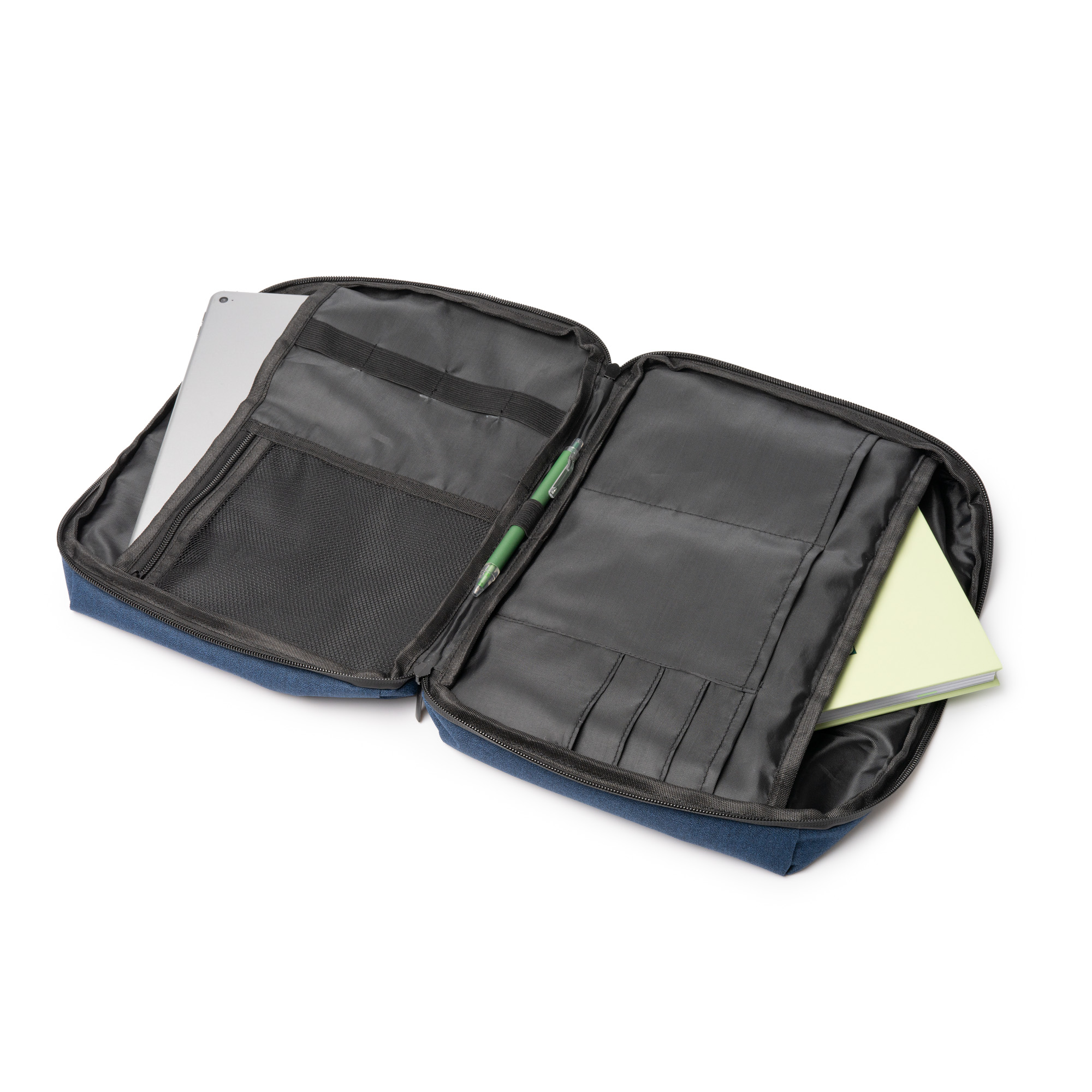 Funda doble con dos compartimentos internos para portátil de hasta 12″ elaborada en RPET 300D y PVC, este tejido y sus cremalleras son repelentes al agua. Esta funda tiene apertura total. Además, cuenta con otros bolsillos complementarios de tamaño medianos y pequeños, y un compartimento en tejido de rejilla con cierre de cremallera. Incluye varias tiras elásticas de sujección para fijar objetos de menor tamaño. Esta funda ofrece también un bolsillo exterior con cierre de cremallera de gran amplitud, lo que la hace una funda completa y práctica.