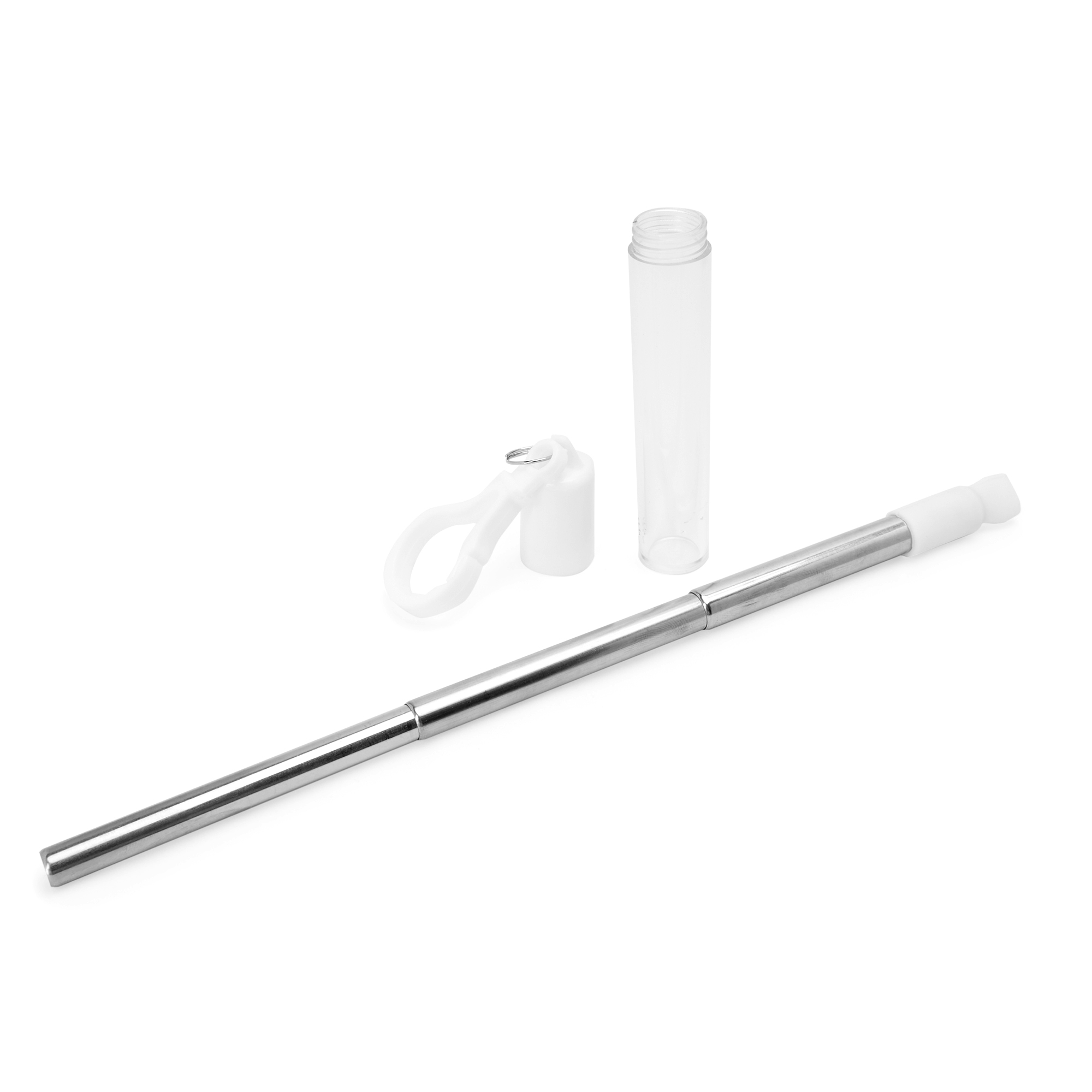 Pajita extensible reutilizable de acero inoxidable 304 con boquilla de silicona. Incluye cepillo limpiador y estuche con mosquetón para transporte.